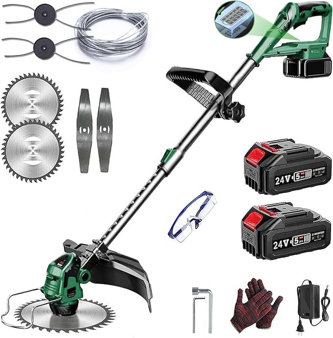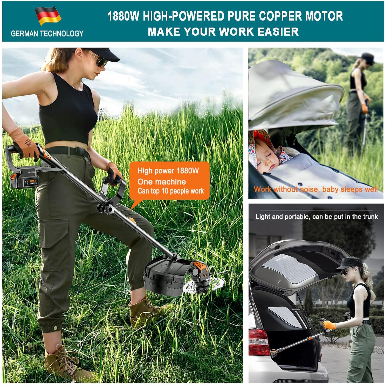 - 🍀【قوية وخفيفة الوزن】 تتضمن هذه الجزازة اللاسلكية للعشب بطاريتين ليثيوم 24 فولت. تتميز بمحرك نحاسي نقي عالي الأداء بقوة 1880 واط وسرعة دوران تصل إلى 18000 دورة في الدقيقة. بوزن 1.8 كجم فقط، تتميز هذه الجزازة فائقة الخفة والمتوازنة بعجلة، مما يجعل إزالة الأعشاب الضارة سهلة كالمشي، ويحسن كفاءة العمل، ويوفر لك الوقت.