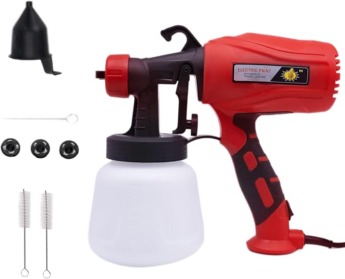 - [ما تحصل عليه] مسدس رش كهربائي، حاوية طلاء سعة 800 مل، قمع، فرشاة تنظيف، إبرة تنظيف، 3 فوهات رش، دليل المستخدم.