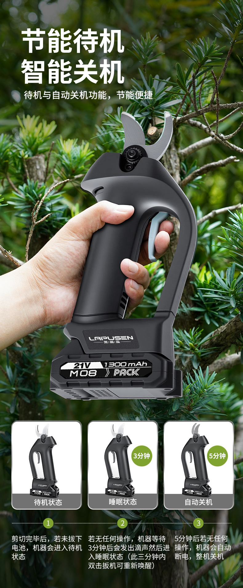 • محمول وواسع الاستخدام: يزن مقص التقليم اللاسلكي كيلوغرامًا واحدًا فقط، مما يجعله سهل الحمل. يتميز بنطاق استخدام واسع، حيث يمكنك تغيير قطر المقص وفقًا لظروف التقليم المختلفة. اضغط على الزناد لمدة 3 ثوانٍ للتبديل بين أوضاع القطع، من 20 مم إلى 30 مم. يمكن استخدامه في مجموعة متنوعة من الحدائق والمتنزهات والمزارع والمراعي الكبيرة والبساتين والصوبات الزراعية، إلخ. كفاءته أعلى من كفاءة المقص اليدوي بـ 8 إلى 10 مرات.