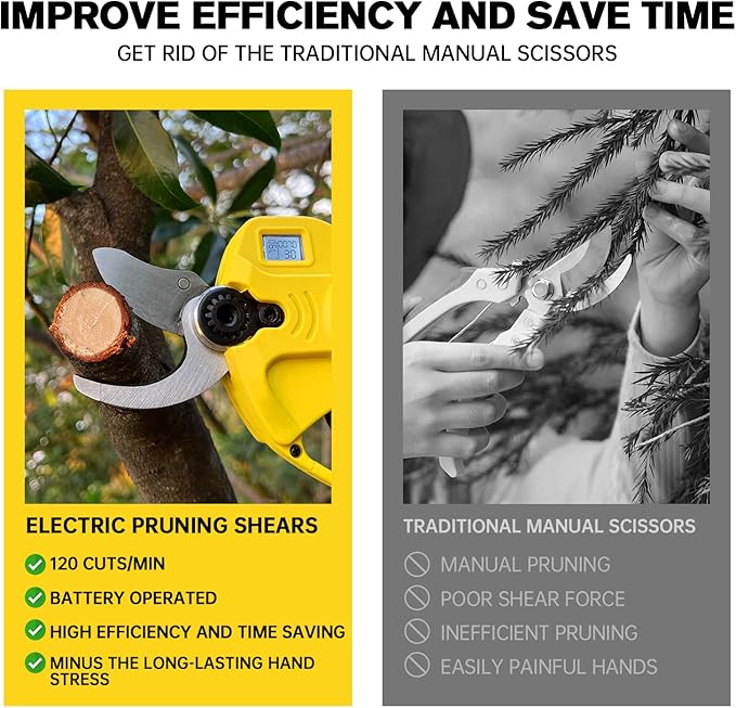 • قص فعال وشاشة LCD ذكية. يستخدم مقص IMOUMLIVE الكهربائي اللاسلكي شفرات متطورة من فولاذ SK5 عالي الكربون، حادة للغاية، مقاومة للصدأ، ومتينة للغاية. يقطع بسهولة فروعًا صلبة يصل طولها إلى 30 مم (1.2 بوصة). تعرض شاشة LCD المُحدثة بدقة طاقة البطارية المتبقية، وعدد مرات القطع، وقطر القطع. يمكنك مراقبة حالة القطع بسهولة.