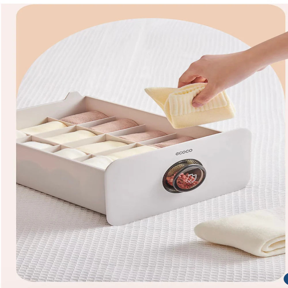 حافظي على جواربكِ وملابسكِ الداخلية منظمة ومنتعشة مع صندوق التخزين "إلهة" 3 في 1. ودّعي الفوضى ورحّبي بالراحة مع مزايا إزالة الروائح الكريهة. الإضافة المثالية لأي خزانة ملابس.