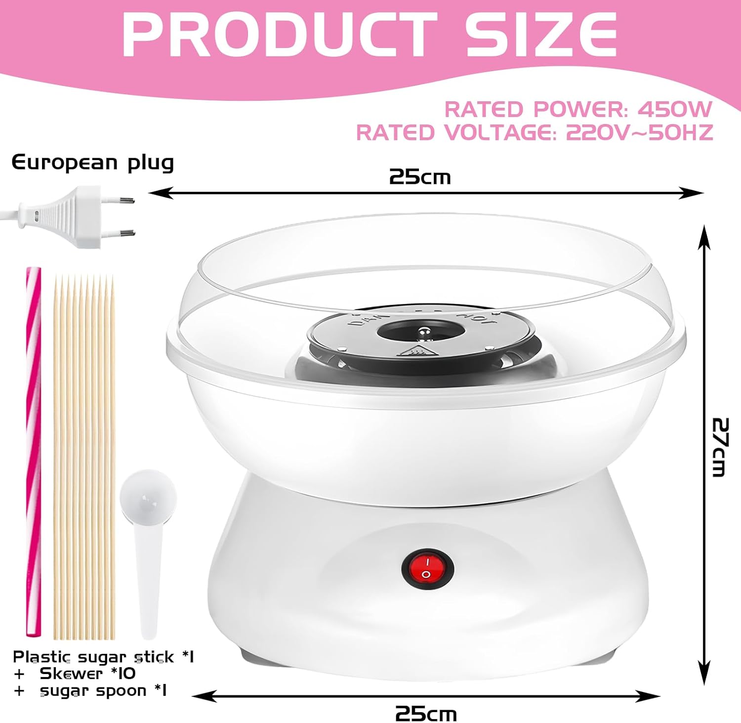 - CONTENU DE L'EMBALLAGE DU MACHINE À BARBE À PAPA:Nous contenons 1 Cotton Candy Machine Blanc d'une taille de 27 cm * 25 cm * 25 cm. Il est également livré avec 1 bâtonnet de bonbon en plastique + 10 bâtonnets + 1 cuillère à sucre. La quantité est suffisante pour répondre à vos besoins.